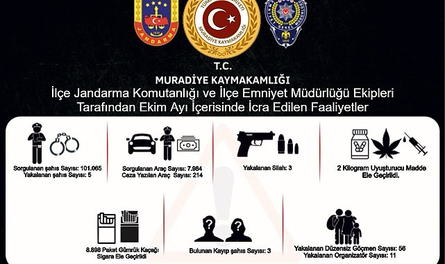 VAN (İHA) – Van'ın Muradiye Kaymakamlığı, ilçe genelinde huzur ve güvenliğin sağlanması amacıyla ekim ayı boyunca gerçekleştirilen güvenlik faaliyetlerine ilişkin verileri paylaştı.