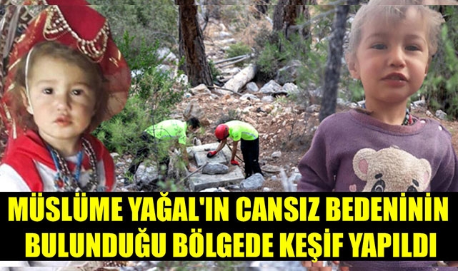 Müslüme'nin kaybolmadan önce görüldüğü bölgede başlayan keşifte, mevkinin küçük kızın cesedinin bulunduğu alana uzaklığı hesaplandı. Jandarma ve AFAD ekiplerinin de destek verdiği keşifte, ormanlık alanda detaylı inceleme yapıldı. Çalışmalarda, çadır ve ağılın konuşlandığı bölge, hayvanların otlatıldığı noktalar ve olay günü aile üyelerinin bulunduğu alanlar kayıt altına alındı. Daha sonra küçük kızın cansız bedeninin bulunduğu arazi incelendi.