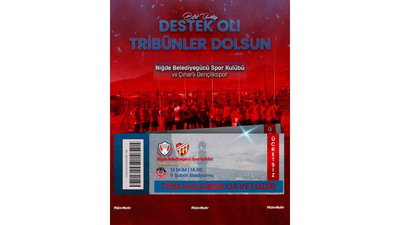 Bölgesel Amatör Lig'de (BAL) mücadele eden Niğde Belediyegücü Futbol Takımı, sezonun heyecan dolu karşılaşmasında taraftarlarıyla buluşmaya hazırlanıyor.Niğde Belediyegücü Futbol Takımı, 12 Ekim Pazar günü saat 14.00'te Niğde 5 Şubat Stadyumu'nda Çınarlı Gençlik Spor ile karşı karşıya gelecek. Niğde Belediyegücü yönetimi, karşılaşmayı ücretsiz hale getirerek tüm sporseverleri tribünlerde takıma destek olmaya davet etti.Taraftarların yoğun ilgi göstermesi beklenen mücadelede, Niğde Belediyegücü yönetimi sahaya galibiyet parolasıyla çıkacaklarını ifade etti.
