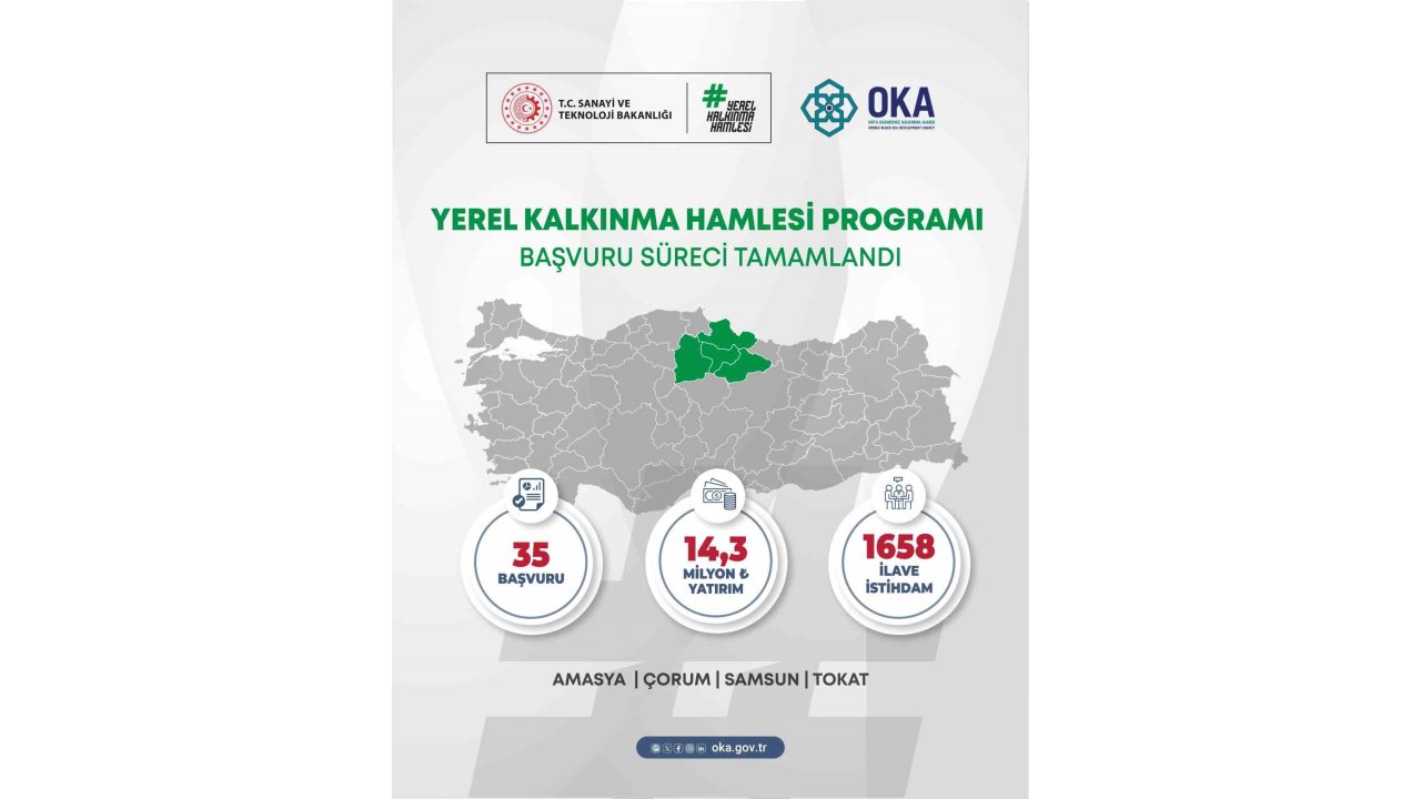 Sanayi ve Teknoloji Bakanlığı Kalkınma Ajansları Genel Müdürlüğü koordinasyonunda yürütülen Yerel Kalkınma Hamlesi Teşvik Programı Çağrısı başvuru süreci tamamlandı.Amasya, Çorum, Samsun ve Tokat illerini kapsayan Orta Karadeniz Bölgesi'nde, Orta Karadeniz Kalkınma Ajansı (OKA) tarafından yürütülen süreçte toplam 35 yatırımcı firma programa başvuruda bulundu. Bu başvurularla birlikte 14,3 milyar TL'lik yatırım hacmi ve bin 658 kişilik yeni istihdam hedefi ortaya kondu.Yatırımcılara rehberlik edildiOKA, Yatırım Destek Ofisleri aracılığıyla Yerel Kalkınma Hamlesi Programı kapsamında potansiyel yatırımcılara yönelik geniş kapsamlı tanıtım ve bilgilendirme faaliyetleri yürüttü.Düzenlenen toplantılarda programın sunduğu yatırım fırsatları, destek mekanizmaları ve iller için belirlenen öncelikli yatırım konuları ayrıntılı şekilde tanıtıldı. İşletme ve kurum ziyaretleri ile çevrim içi bilgilendirme toplantılarında yatırımcılara doğrudan bilgi aktarılarak sürece rehberlik edildi.Bölge için desteklenecek sektörlerAMASYA: Jeotermal sera tesisi, bitkisel ham ve rafine yağ üretimi, beş yıldızlı konaklama tesisi, asgari 1000 büyükbaş kapasiteli entegre süt üretim ve süt işleme tesisi.ÇORUM: Alaşımlı döküm ürünleri üretimi, raylı sistemler imalatı, iş makineleri üretimi, likit yumurta ve yumurta tozu üretimi.SAMSUN: Silah ve silah parçaları üretimi, akıllı filtre sistemleri üretimi, metal ve kauçuktan ticari araç aksam ve parçaları üretim tesisi, tıbbi cihaz üretimiTOKAT: Meyve ve atıklarından katma değerli ürünler üretimi, yüksek ekonomik değere sahip endüstriyel süt ürünleri üretimi, maya üretim tesisi, asgari 500 baş manda süt hayvancılığı ve süt ürünleri üretim tesisi."Yerel kalkınma için güçlü bir adım"OKA Genel Sekreteri Mehlika Dicle, Yerel Kalkınma Hamlesi Teşvik Programı'nın bölgesel üretim kapasitesinin artırılmasına ve yerel kalkınmaya katkı sağlayacağına dikkat çekerek şunları söyledi:"Program, bölgemizin üretim gücünü ve yatırım ortamını güçlendirmeye yönelik önemli fırsatlar sunuyor. Çağrı süreci boyunca yatırımcılarımıza rehberlik ederek, illerimizin öncelikli yatırım alanlarına ilişkin bilgilendirme çalışmalarımızı titizlikle yürüttük. Yapılacak yeni yatırımların, bölgemizin sahip olduğu potansiyeli harekete geçirerek yerel kalkınma yolunda yeni fırsatlara kapı aralamasını temenni ediyoruz."