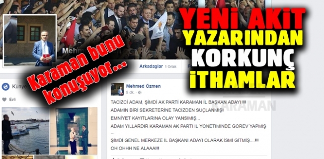 Bugün Karaman siyasetine deyim yerindeyse tam anlamıyla bir bomba düştü.Yeni Akit Gazetesi yazarlarından Mehmed Özmen kişisel facebook hesabından yaptığı paylaşımda öyle ifadeler kullandı ki, bu ifadeler bir anda Karaman’da siyasetin gündemine oturdu. AK Parti, Karaman ve Mayfa kavramını aynı cümle içerisine taşıyan Özmen, ağır ifadelerini yer yer hakaretlerde de bulunarak daha da ileriye taşıdı.Özmen yazdığı yazıda, Ziraat Odası Başkanı Recep Muğlu ve Ziraat Odası Meclis Başkanı Mehmet Bayram‘ı, AK Parti’yi kullanarak mafyalaşmakla suçlarken, ayrıca adı geçen isimleri siyasi rant elde etmek uğruna şantajcılıkla suçladı.Özmen’in paylaştığı yazıya ise verilmesi beklenen tepkiler de gecikmedi. Recep Muğlu, kişisel facebook hesabından Özmen’in iddialarına sert bir şekilde cevap verirken, yaşanan iddialarla ilgili ivedilikle hukuki yollara başvuracağını açıkladı.Kaynak:Haberkaraman.com