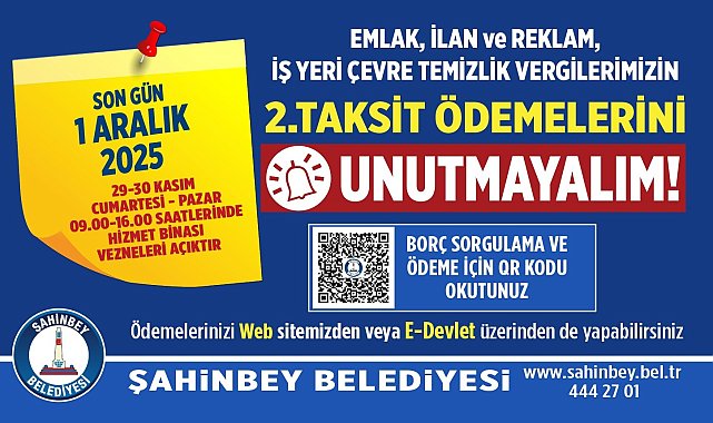 Şahinbey Belediyesi, 2025 yılı Emlak Vergisi, İş Yeri Çevre Temizlik Vergisi ile İlan ve Reklam Vergisi borçlarının ikinci taksit ödemeleri için son tarihin 1 Aralık 2025 Pazartesi olduğunu hatırlattı. Şahinbey Belediye Başkanı Mehmet Tahmazoğlu, vatandaşlara çağrıda bulunarak gecikme cezalarıyla karşılaşılmaması için ödemelerin zamanında yapılması gerektiğini vurguladı.