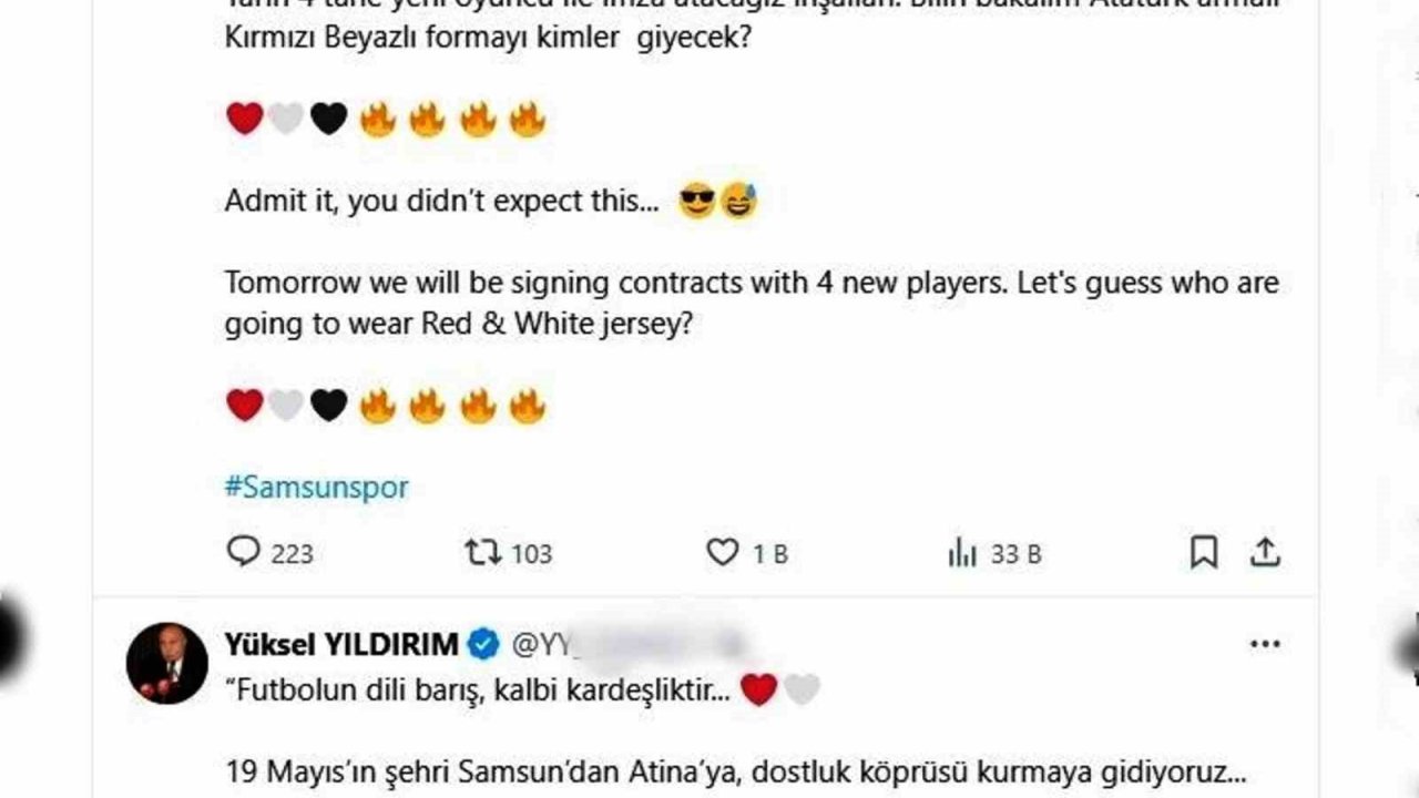 Samsunspor Başkanı Yüksel Yıldırım, UEFA Avrupa Ligi play-off mücadelesi öncesinde 4 yeni transfere imza attıracaklarını açıkladı.UEFA'ya kadro listesi göndermeye kısa bir süre kala kendisine ait sosyal medya hesabından açıklamada bulunan Samsunspor Başkanı Yüksel Yıldırım, "Hadi bakalım, kabul edin artık. Hiçbiriniz bunu beklemiyordu. 4 tane yeni oyuncu ile imza atacağız inşallah. Bilin bakalım Atatürk armalı kırmızı-beyazlı formayı kimler giyecek?" dedi.Panathinaikos eşleşmesi hakkında da konuşan Başkan Yıldırım, "Futbolun dili barış, kalbi kardeşliktir. 19 Mayıs'ın şehri Samsun'dan Atina'ya dostluk köprüsü kurmaya gidiyoruz. Mustafa Kemal Atatürk'ün sözleriyle: Yurtta Sulh, Cihanda Sulh. Bizim Samsunspor'un söylemiyle de: Sahada rekabet, tribünde dostluk" diye konuştu.Öte yandan Samsunspor'un transfer döneminde kaleci Noel Törnqvist, orta saha Eyüp Aydın, ofansif oyun kurucu Afonso Sousa, kanat forvet Vaclav Cerny, santrafor Simon Banza, stoper Toni Borevkovic, forvet Silas Katompa-Mvumpa, santrafor Kelechi Iheanacho, kanat Denis Suarez ve orta saha Salih Uçan ile adı geçmişti. Sözleşme imzalanacak 4 ismin bu isimler arasından olabileceği belirtiliyor.