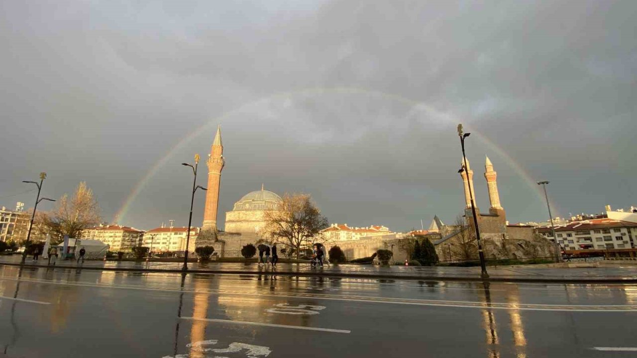 Sivas'ta akşam saatlerinde etkili olan sağanağın ardından gökyüzünde çıkan gökkuşağı, izleyenlere adeta görsel şölen sundu.