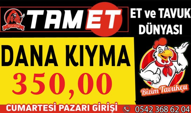 Bu kez, size özel bir kampanya ile geliyoruz! Karaman ekonomisini düşünen TAMET Kasabı, en sevilen ürünlerinden biri olan Dana Kıyma için muhteşem bir indirim sunuyor.Kampanya Detayları:Dana Kıyma Sadece 350 TL! Siz değerli müşterilerimiz için özel olarak belirlenen kampanya kapsamında, TAMET Et ve Tavuk Dünyası'ndan taze, kaliteli Dana Kıyma sadece 350 TL! Sağlıklı ve lezzetli bir sofra için bu fırsatı kaçırmayın.Kalite Adresiniz: TAMET Et ve Tavuk Dünyası Cumartesi pazarı girişinde bulunan mağazamızda, uzman kasaplarımızın titizlikle hazırladığı ürünlerimizi bulabilirsiniz. Hijyenik koşullarda üretim ve satış yaparak, sizlere en kaliteli ürünleri sunmaya devam ediyoruz.İletişim Bilgileri: Size en yakın TAMET Et ve Tavuk Dünyası mağazamıza uğramak ve kaliteli ürünlerimizi keşfetmek için bize aşağıdaki iletişim bilgilerinden ulaşabilirsiniz.Adres: Cumartesi Pazarı Girişi