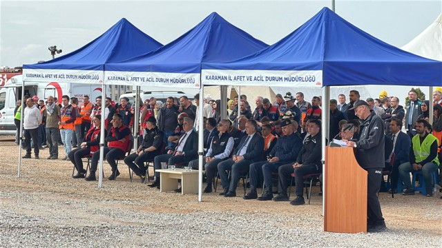 Karaman Afet ve Acil Durum Yönetimi İl Müdürlüğü (AFAD) tarafından yerel saha tatbikatı yapıldı. Tatbikatlar 3 ayrı vaka üzerine AFAD Eğitim Parkurunda gerçekleşti. AFAD, UMKE, Jandarma, Kızılay, İl Özel İdaresi, İtfaiye Müdürlüğü, Karaman Belediyesi, Cenaze Müdürlüğü ve 112 sağlık ekibinden toplam 282 personel ve 65 aracın görev aldığı tatbikatlarda vatandaşlar da rol aldı. Senaryo gereği Başakşehir Mahallesi merkezli 5.8 büyüklüğündeki depremde Üniversite Mahallesi'ndeki evler yıkılarak yerle bir oldu. Yıkılan bir evin yanına gelen vatandaşlar yakınları için gözyaşı döktü. Ekipler yıkılan evin enkazından bir kişiyi yaralı olarak kurtarırken, 1 kişinin de cesedini çıkardı. Deprem sonrası çıkan yangın itfaiye ekiplerince söndürüldü, kimyasal maddeden etkilenen bir kişi de özel kıyafetli görevlilerce kurtarıldı. Başarıyla tamamlanan tatbikat sonrası Vali Mehmet Fatih Çiçekli ve il protokolü görevli personelle fotoğraf çekindi.