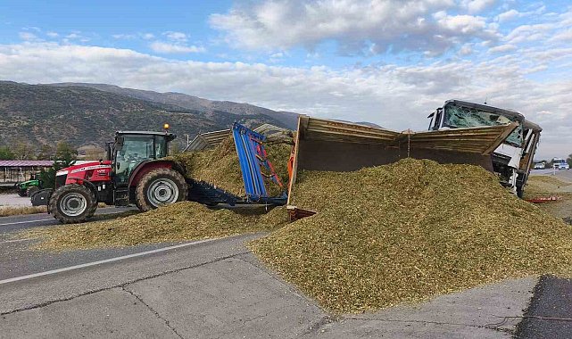 Afyonkarahisar'da kontrolden çıkan tırın önünde seyreden traktöre çarpması sonucu meydana gelen trafik kazasında 2 kişi yaralanırken, olayda traktörün römorkunda taşıdığı yaklaşık 2 ton hayvan yemi ise çevreye saçıldı.