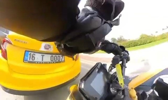 Bursa'da seyir halindeki motosiklet sürücüsü, önünde duran taksiyi görmeyip çarptı. O anlar motosiklet sürücüsünün aksiyon kamerasına yansıdı.Kaza dün öğle saatlerinde Nilüfer ilçesinde meydana geldi. Trafikte seyreden motosiklet sürücüsü, etrafına baktığı sırada trafik durdu. Önünde duran ticari taksiyi fark etmeyen motosiklet sürücüsü taksiye arkadan çarparak devrildi. O anlar motosiklet sürücüsünün aksiyon kamerasına yansıdı.
