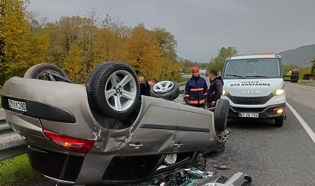 Zonguldak'ın Çaycuma ilçesinde meydana gelen trafik kazasında yolun ıslak ve zeminin kaygan olması nedeniyle sürücüsünün direksiyon hakimiyetini kaybettiği otomobil kontrolden çıkarak taklalar attı. Otomobil kaza sonrasında ters şekilde durabildi. Kazada iki kişi yaralandı.