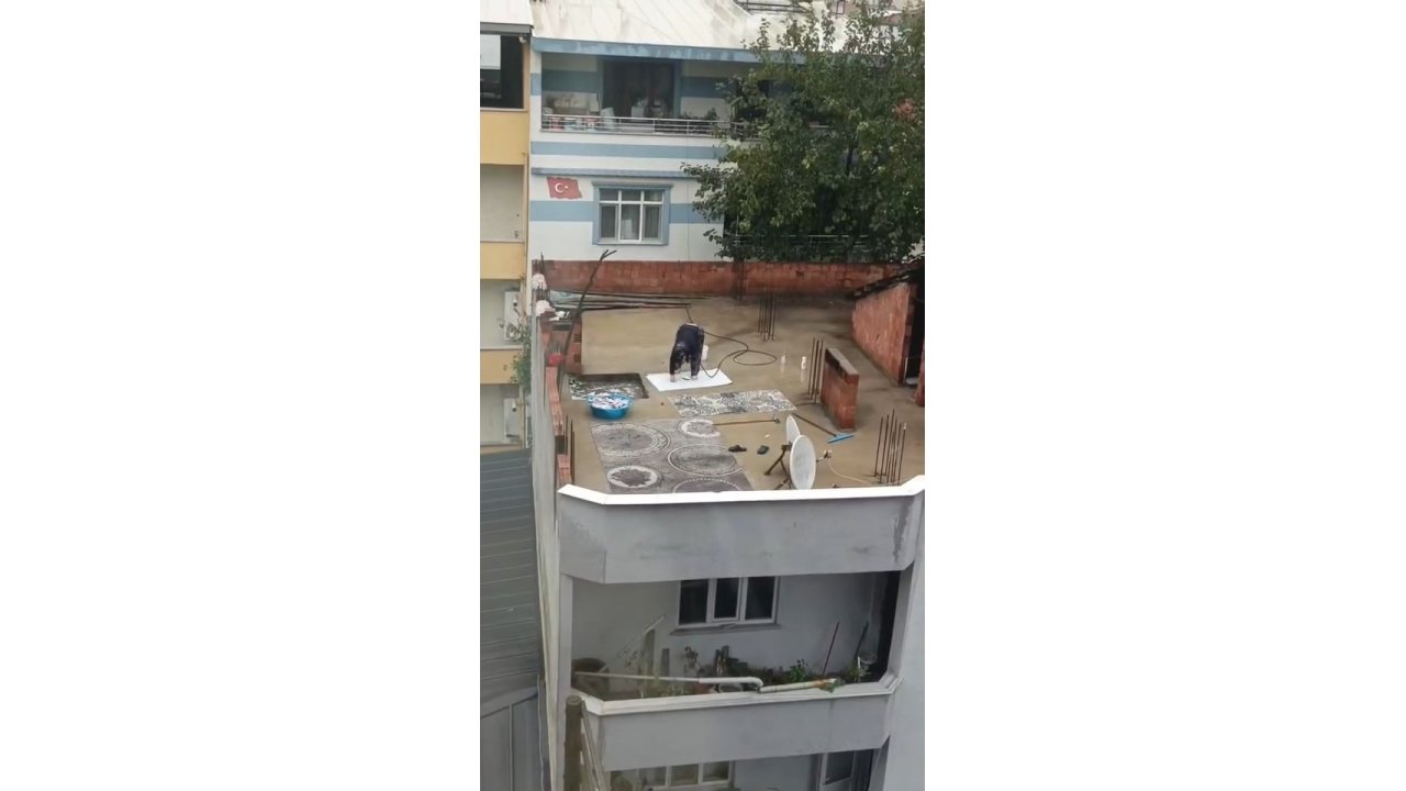 Yağmurlu Havada Çatıda Halı Yıkadı, Görenler Şaştı Kaldı
