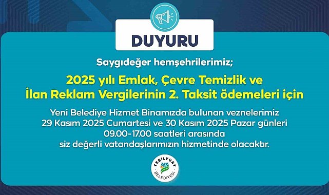 Yeşilyurt Belediyesi Gelirler Müdürlüğüne bağlı vezneler, 2025 yılı Emlak, Çevre Temizlik ve İlan Reklam Vergisi 2. Taksit ödemelerini yapacak olan vatandaşlara kolaylık sağlamak amacıyla hafta sonu da hizmet verecek. Yoğunluğun azaltılması ve vatandaşların mağduriyet yaşamaması için belediye vezneleri, 29 Kasım Cumartesi ve 30 Kasım Pazar günleri açık tutulacak.